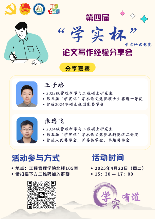 “学实杯”学术论文竞赛为面向betway88西汉姆联全体在校生举办的赛事,聚焦复杂工程管理、运营与供应链管理、金融科技与金融工程、智能制造与智能工程研究领域。本届竞赛投稿通知四月上旬一经发出便受到广泛关注,收到来自各个学院本硕博员工的踊跃投稿。征稿期间,学院举办“学实有道”系列学术交流活动,以“学思浩瀚,实见真知”为题,组织第三届学实杯获奖者分享论文写作经验与科研心得,指引学术之道,助力学子们在学术之路上攀登向前,不断突破、成长!