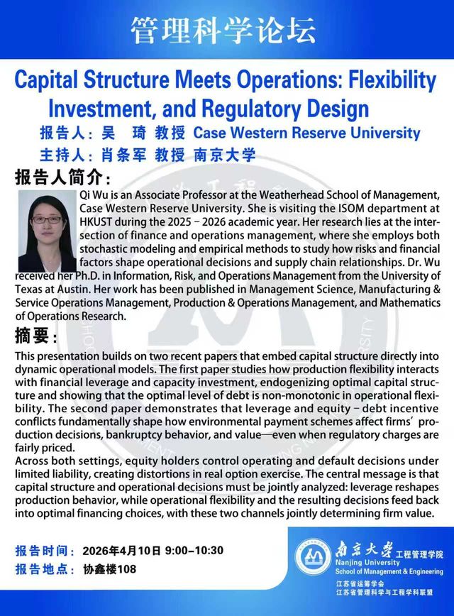 管理科学论坛:Capital Structure Meets Operations: Flexibility Investment, and Regulatory Design