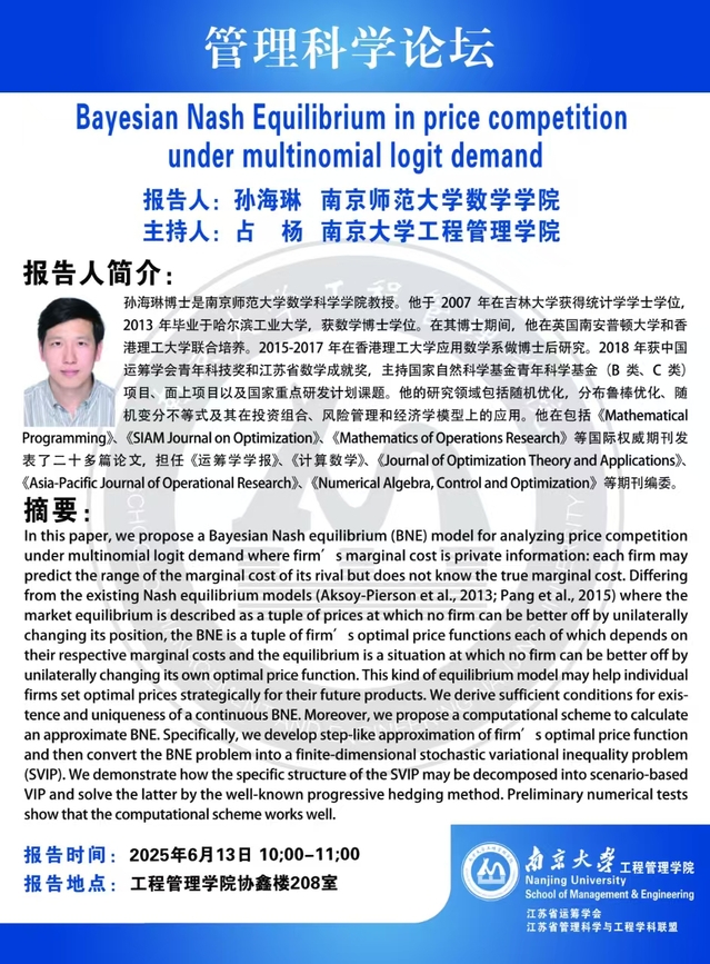管理科学论坛:Bayesian Nash Equilibrium in price competition under multinomial logit demand