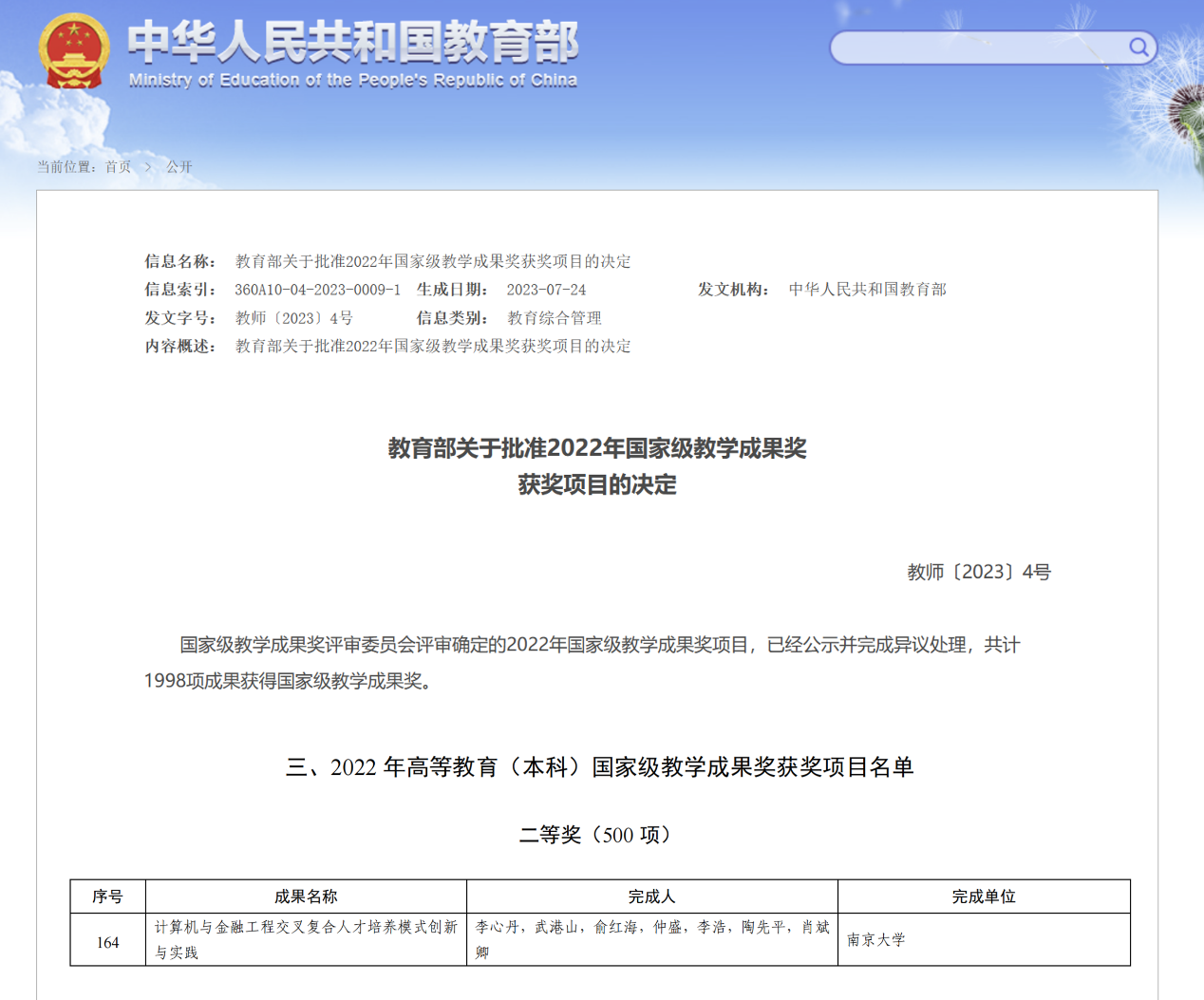 2023年7月24日,2022年高等教育国家级教学成果奖正式公布。根据教育部教师(2023)4号“教育部关于批准2022年国家级教学成果奖获奖项目的决定”,betway88西汉姆联和计算机科学与技术系联合申报的教学成果《计算机与金融工程交叉复合人才培养模式创新与实践》荣获高等教育(本科)国家级教学成果奖二等奖。该项目的主要完成人为李心丹,武港山,俞红海,仲盛,李浩,陶先平,肖斌卿。
