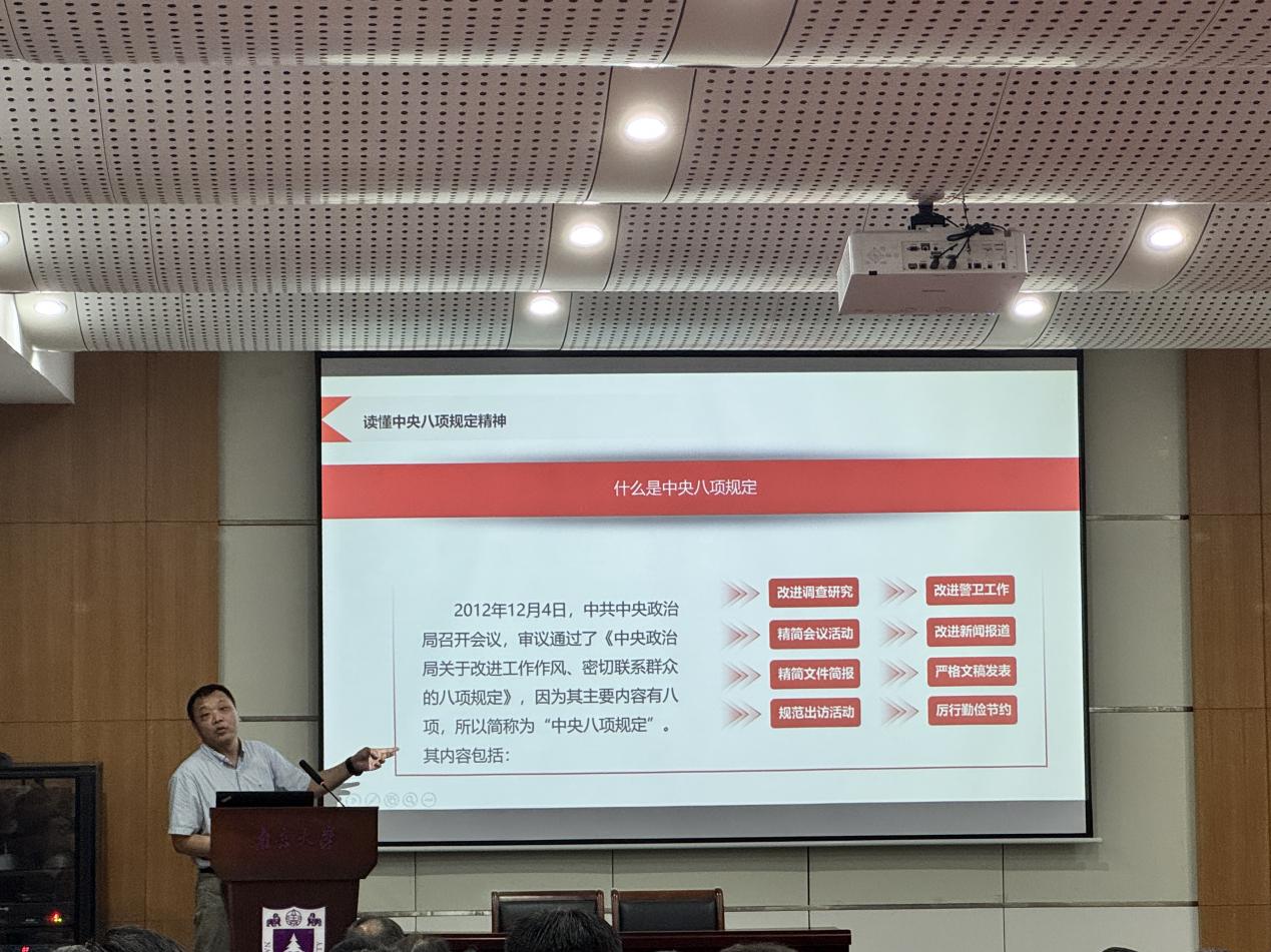 会上,陈志云以《以案为鉴 以案明纪》为题上专题党课,面向全体教职工开展深入贯彻中央八项规定精神学习教育暨师德师风专题警示教育。党课从深入贯彻中央八项规定精神学习教育的目标要求和重要意义切入,阐释了中央八项规定精神的实质,并结合违反中央八项规定精神的典型表现和运用10个由风及腐的典型案例,阐述了深入贯彻中央八项规定精神的现实意义。报告指出,开展深入贯彻中央八项规定精神学习教育,是纵深推进全面从严治党的重要举措,是密切党群干群关系、巩固党的执政基础的必然要求,是推进中国式现代化的有力保障。全体党员和全体教职员工要充分认识这次学习教育的重要意义,锲而不舍贯彻中央八项规定精神,推动党的作风持续向好。