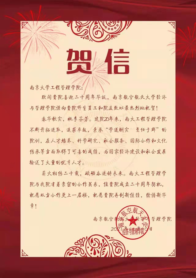 南京航空航天大学经济与管理学院致betway88西汉姆联贺信