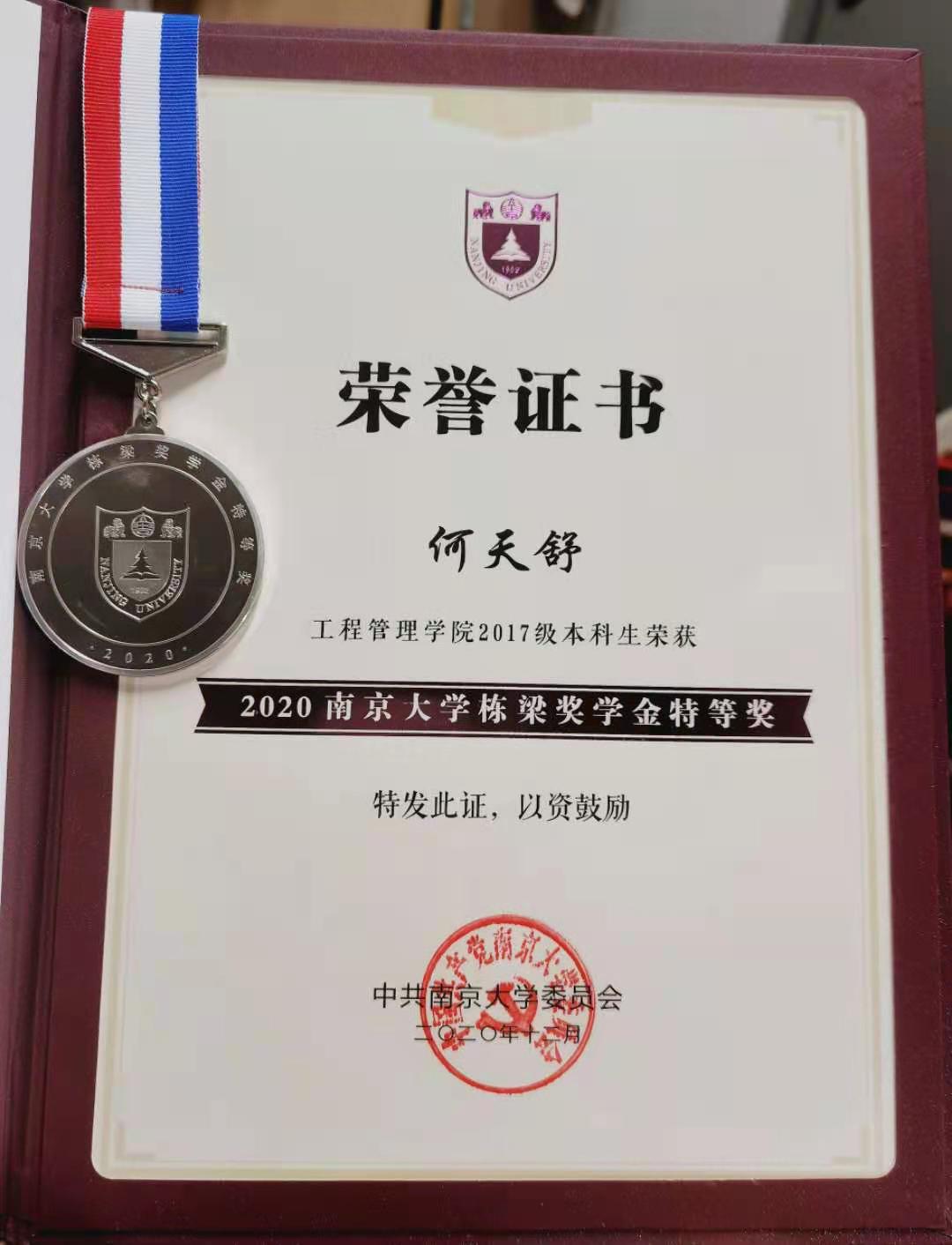 2017级实验班何天舒同学荣获betway88西汉姆联栋梁特等奖