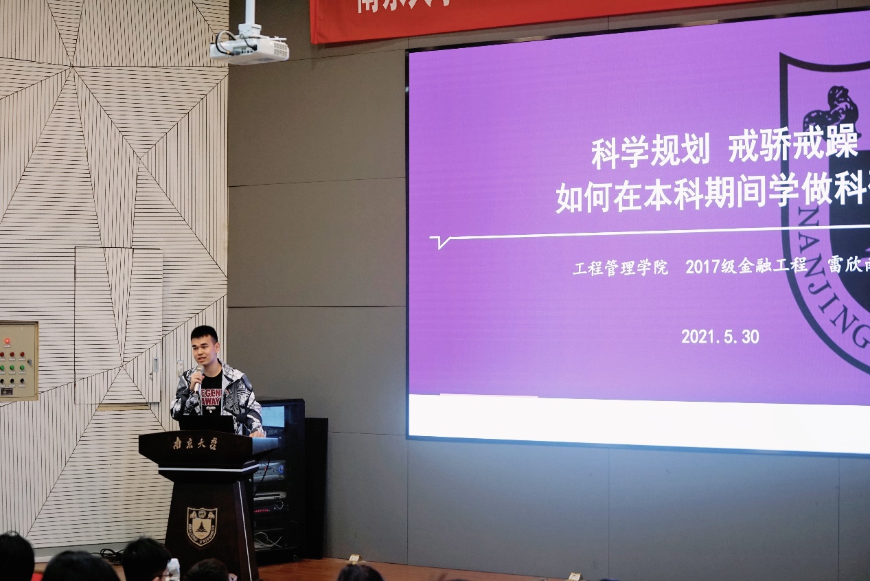 17级本科生雷欣南就自己大四期间的科研经历给同学们分享了一些他的心得体会。首先大创和课程论文是做研究和写论文的主要来源,他建议去向已经确定,有时间的同学可以利用大四上学期的时间梳理个人成果。二是建议获得推免的同学提前进入导师团队,以更快地适应环境,接受专业的科研训练。三是毕业论文是一个非常好的科研机会,全过程有老师指导,容易形成高质量的研究成果。