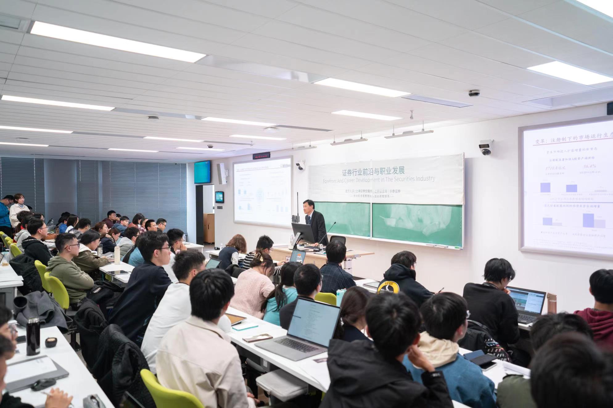 在授课阶段,朱博士带来题为“破局与重塑:开放化与数字化变革时代的证券业发展之路”的课程。他聚焦开放化与数字化变革时代的证券业发展之路,以“变”为核心,介绍了“百年未有之大变局”背景下的金融业发展动态,包括金融开放背景下的注册制改革、数字化转型下的券商商业模式变革和华泰证券以科技赋能的双轮驱动发展。他指出,随着业务的不断升级,未来的金融机构对于复合型人才的需求,需要具备量化研究、数理基础的员工加入,这与betway88西汉姆联人才培养的理念、目标高度契合。问答环节中同学们积极参与、踊跃提问,朱博士也都耐心一一解答。讲座后同学们纷纷提出,希望能增加问答环节时间,对活动意犹未尽。