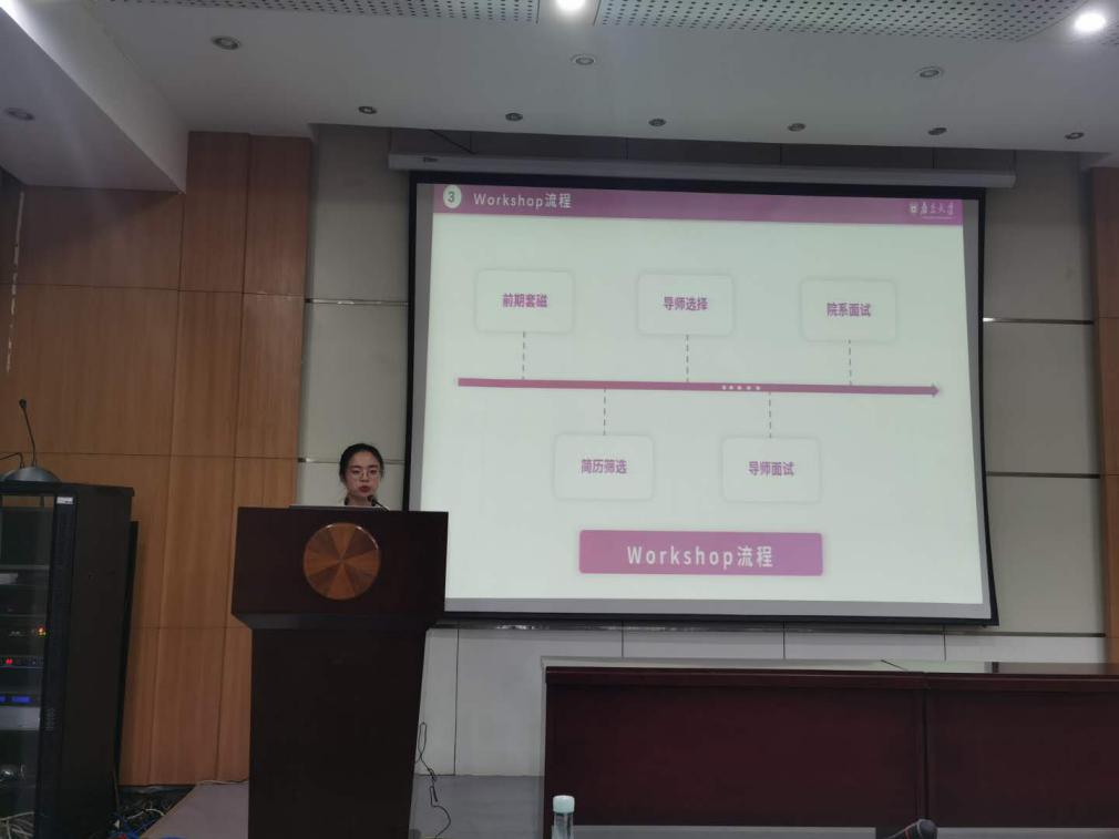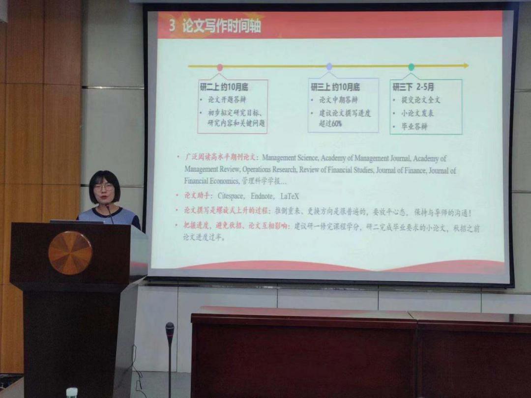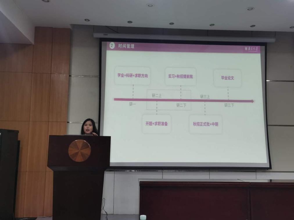 原学院研究生会主席赖苑苑带来了“如何高效度过研究生三年——开启工管人时间轴”主题分享,她从研究生整体安排时间轴、技能提升时间轴、论文写作时间轴以及考博求职时间轴等四个角度分享了自己的学习和工作经验。她表示:三年研究生学习时间十分短暂,要尽早做好是否读博的决定,充分利用课余时间全面提升自己,找准开启研究生高效时间轴的关键因素。