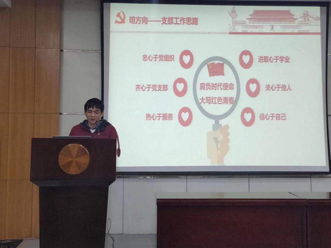 2018级硕士生第四党支部组织委员刘煜昊同学进行了题为“课程学习与支部工作经验分享”的主题分享。他以幽默风趣的语言阐述了“上课学什么”、“听不懂或不感兴趣的课程应该怎么学”,让大家对课程学习有了新的感悟。围绕支部建设,他介绍了所在支部的特色做法,强调支部建设要从筑基础、明方向、抓建设和重创新四个点出发,开展工作时要注重活动质量,吸引大家广泛参与。