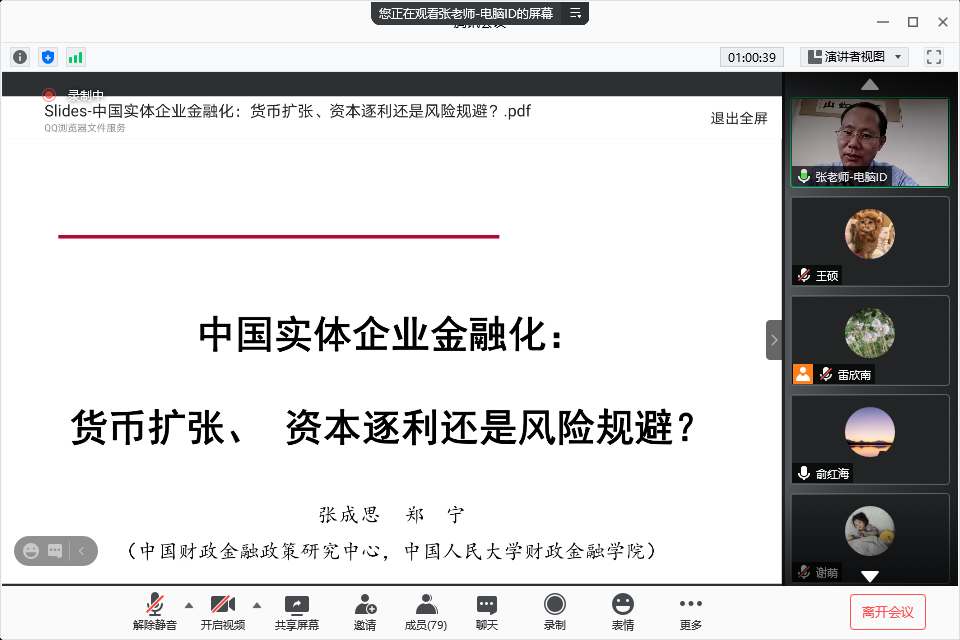 在讲座的最后,张成思教授针对老师和同学们的提问进行了解答,深入浅出地阐释了货币扩张如何体现在“挤出效应”和“蓄水池效应”中,老师同学们均表示获益匪浅。最后,主持人俞红海教授表达了对张成思教授莅临指导的感谢,同时也欢迎张教授有机会亲临南大线下指导。