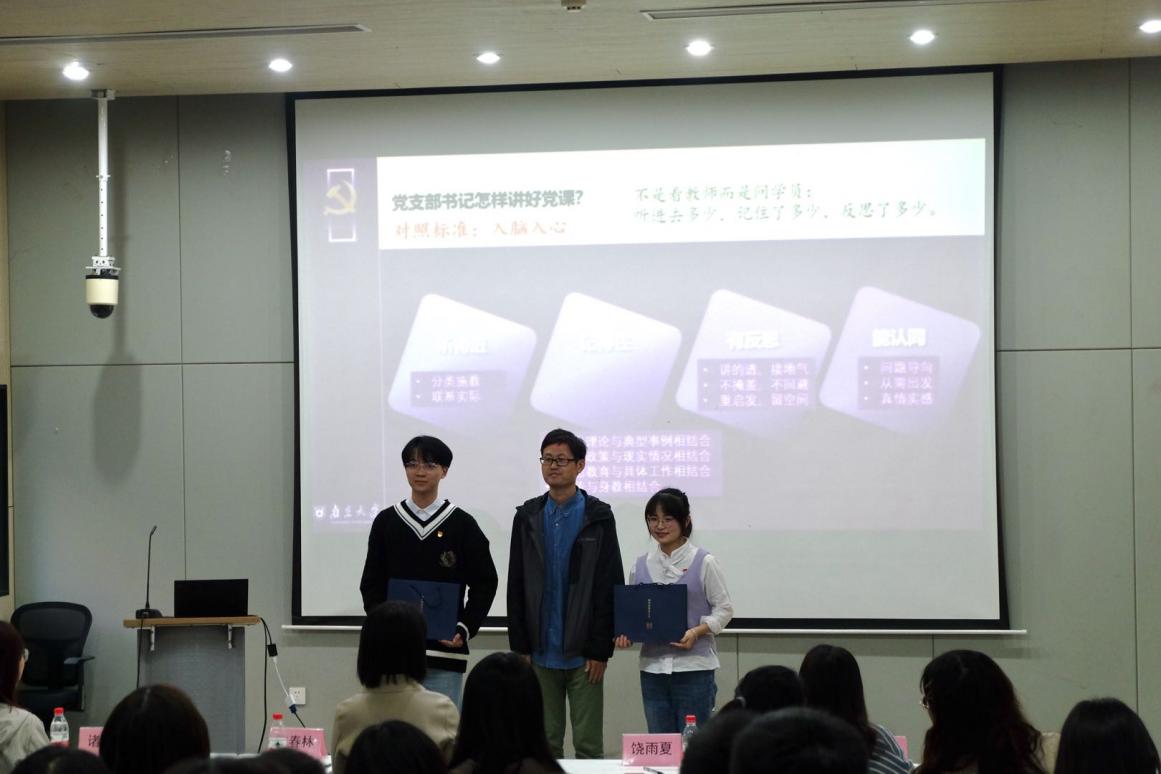 陈力立书记在点评的同时,讲述了上好党课的重要性。她说,衡量一堂党课是否合格的标准是立场是否正确以及是否入脑入心,她建议从宏观、中观、微观三个层次入手,把握大处着眼、小处着手的要求,体现时代性和需求性,以适合的形式与节奏讲好党课。针对微党课讲演的具体内容,她肯定同学们备课充分、理论扎实,能够感受到情感的真挚。党课中提到的南大哲学系胡福明老师推动的思想解放运动的实例,能够引发作为南大人的骄傲与自豪。结合党课中有关中国工业发展的内容,她希望同学们多深入产业与行业,充分了解中国行业的发展所需、树立正确的就业观和价值观,争取获得不断进步。