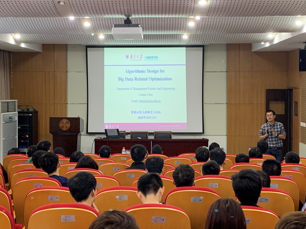 陈彩华老师带来题目为《Algorithmic Design for Big Data Related Optimization》的学术报告,介绍了与大数据相关优化算法,从大规模结构化优化,分布鲁棒性优化和强化学习中的优化三个部分介绍了各种优化算法,同时还和同学们交流了如何在自己的科研中发现问题并解决问题。