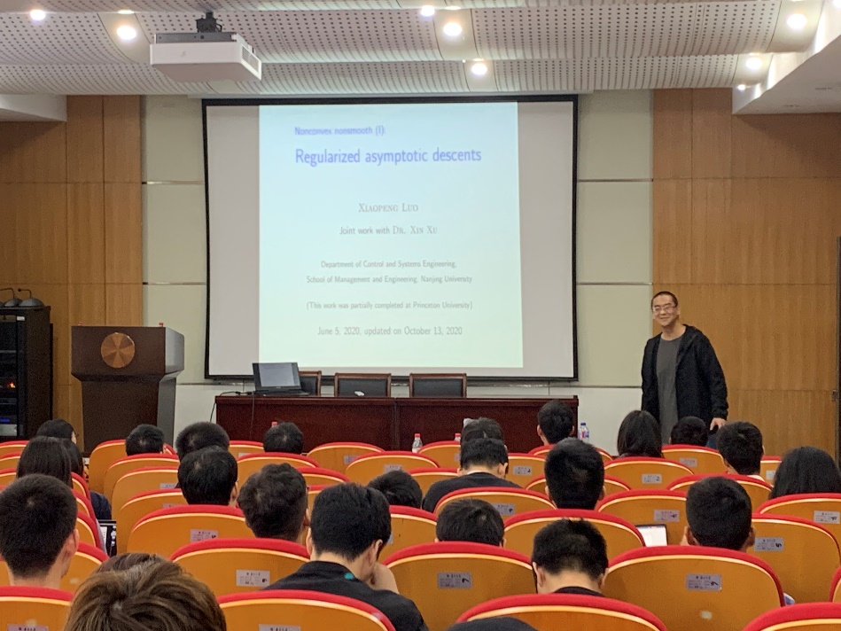 罗晓鹏老师带来题目为《Regularized Asymptotic Descents》的学术报告,从背景、假设、正则化迭代到其算法和分析,详细介绍了正则化渐近下降方法,提出了在有假定的条件下非凸优化全局收敛的高效迭代方法。