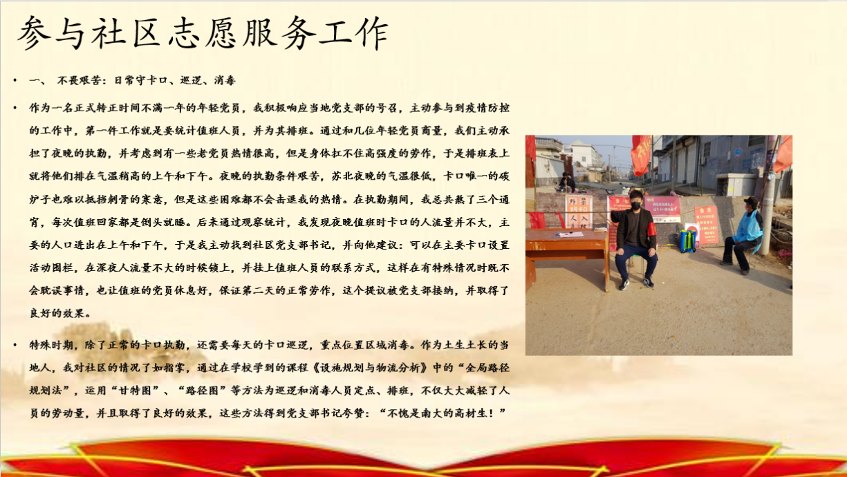 betway88西汉姆联有多名党员和入党积极分子在疫情期间担任过志愿者。立志从事选调生工作、在江苏省靖江市人民政府城南办事处同兴社区从事志愿服务的员工党员褚家明表示,在国家需要的时候,站出来尽自己的一份力是党员和团员义不容辞的责任。相信举国上下齐心协力,共克时艰,疫情定会过去,必将迎来最美的春天。在2019级硕士第二党支部的组织生活会上,研二的员工党员刘远达讲述了自己在疫情期间所做的志愿服务心得体会。据了解,他的工作是在连云港市赣榆区守卡口、巡逻、消毒。他还利用所学为当地产业出谋划策,将疫情期间当地大量难以处理的鹌鹑雏苗和冰库厂结合起来,引入鹌鹑雏苗处理的新方法,一定程度挽回了当地孵化厂的经济损失,也为当地的冰库厂增加了收益,赢得了当地居民的交口称赞。