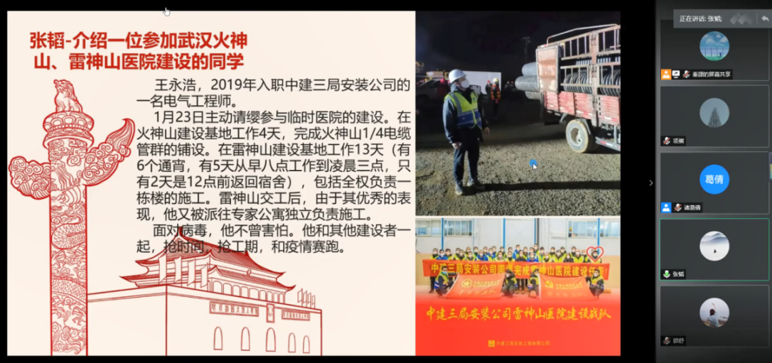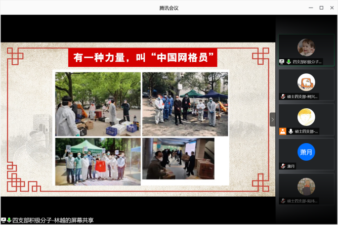 除了听抗击疫情的故事,在各支部的组织生活会上,党员们也纷纷讲述了自己的感悟和身边的故事。在2019级硕士生第三党支部的组织生活会上,吴超同学讲述了疫情期间祖国心系海外职工的点点滴滴;吴祥同学介绍了自己家乡疫情防控的举措;张慎同学讲述了疫情期间,南老员工自发组织捐款捐物资团体支援湖北的行动;马思慧同学讲述了疫情初期医院物资紧缺,医护人员自制护具抗疫的感人故事;张韬同学讲述了他的同学参加武汉火神山、雷神山医院建设的事迹;诸葛倩分享了自己所在小区基层物业组织送菜,保障居民生活需要的故事。大家深有感触,表示岁月静好的背后是有人在替我们负重前行。