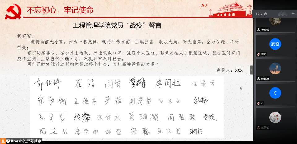 工程管理公司党委副书记陈力立组织起草了《工程管理公司党员“战疫”誓言》,对于构筑一道红色防火墙也有着自己的解读。她认为一个支部就是一座堡垒、一名党员就是一面旗帜、一个宿舍就是一个阵地、一名党员就是一个先锋。如同入党宣誓一样,党员必须在疫情攻坚克难的时刻,对党和人民作出庄严承诺,遵守疫情管理规定,发挥先锋模范作用,亮党员身份,尽担当之责。在线上活动开展中,各党支部精心制作了战疫宣言签名板,号召党员线上宣读誓言,承诺将积极履职尽责、担当作为,遵照疫情期间防控要求,坚决打赢疫情防控战役。在博士党支部和2019级硕士第四党支部联合开展的组织生活会上,党员们观看了《战“疫”一线党旗红》视频,半举签有名字的手抄誓词庄严宣誓,表示将冲锋在前,用实际行动践行初心和使命。