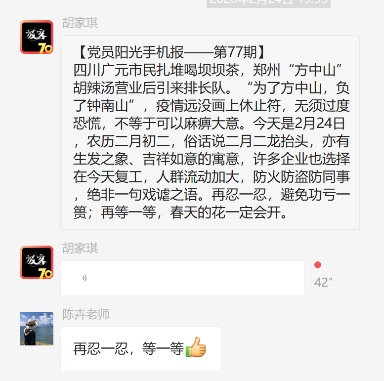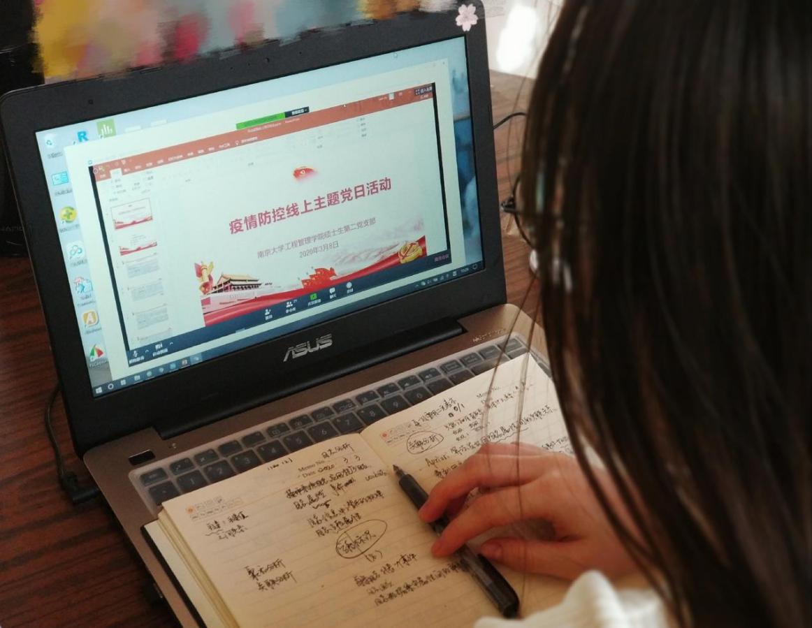 此外,其他支部的“云端”党日也精彩纷呈、兼具实效。如:本科生党支部开展了“学雷锋、共抗疫,自勉不息”主题活动;博士党支部以“疫情期间作为党员如何发挥先锋模范作用”为主题开展了讨论;2019级硕士第一党支部开展了集中学习;第二党支部开展了“云上话新冠,路遥而情切”主题党日;第三党支部吴超同志,分享了自己担任社区志愿者的经历;第四党支部每两人结对组成学习小组,录制视频解读文件精神,分享学习体验。工程管理公司党委副书记陈力立希望每名员工党员在疫情中都可以做到胸怀大局,以青年担当之心“树”好党员形象,“立”好党员品行。