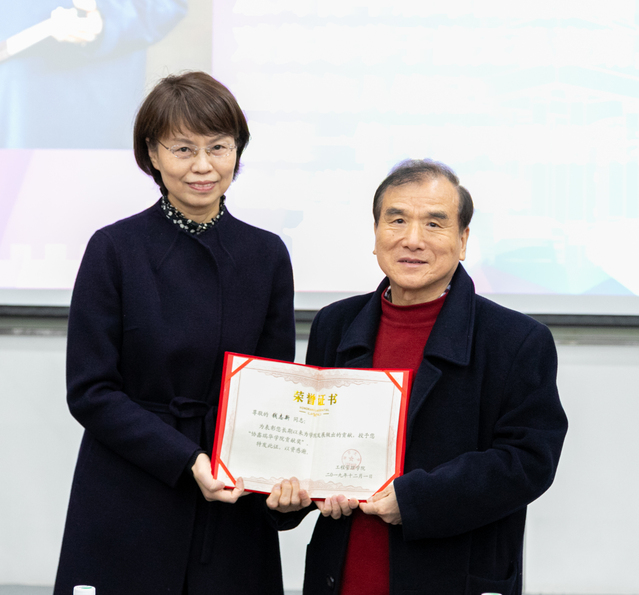 接下来举行了为前辈奋斗者颁奖的仪式。已经退休的教师焦小澄、汪瑞林、盛昭瀚、徐顺利、周跃进和钱志新主任依次上台,由陈力立副书记宣读致敬词,陈伟书记和周晶经理分别向他们颁发感谢状和“协鑫瑞华学院贡献奖”。青年教职工代表为六位老师献花,向前辈奋斗者致以深深的敬意。