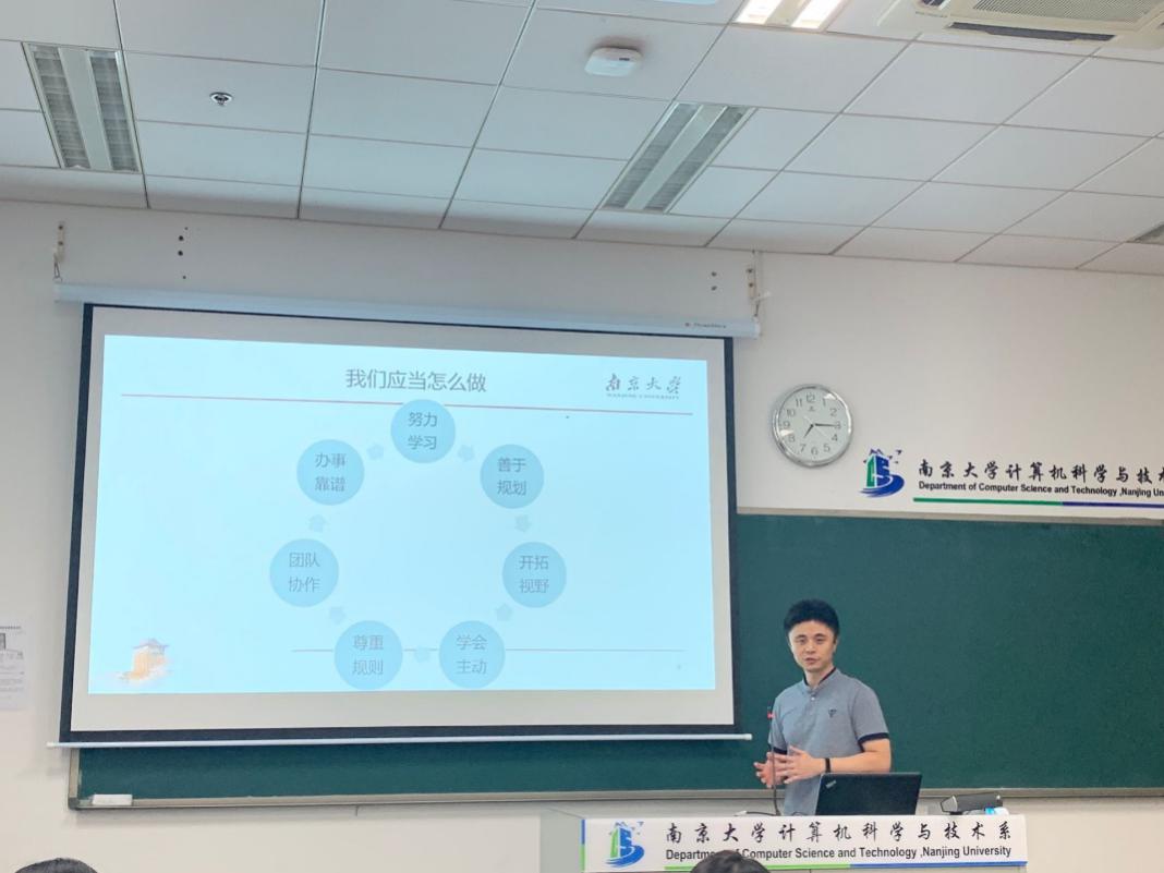 仲盛教授幽默地提起了为实验班选拔笔试命题的经历,笑言这对于老师和同学们来说都是一次非常刺激的挑战。随后他介绍了自己的研究领域,期待对区块链、金融密码学感兴趣的同学能多多交流。最后,仲主任对大家提出寄望,希望大家充分利用实验班完整的培养体系和优秀的平台,要用高标准要求自己,在四年里取得第一流的成绩。