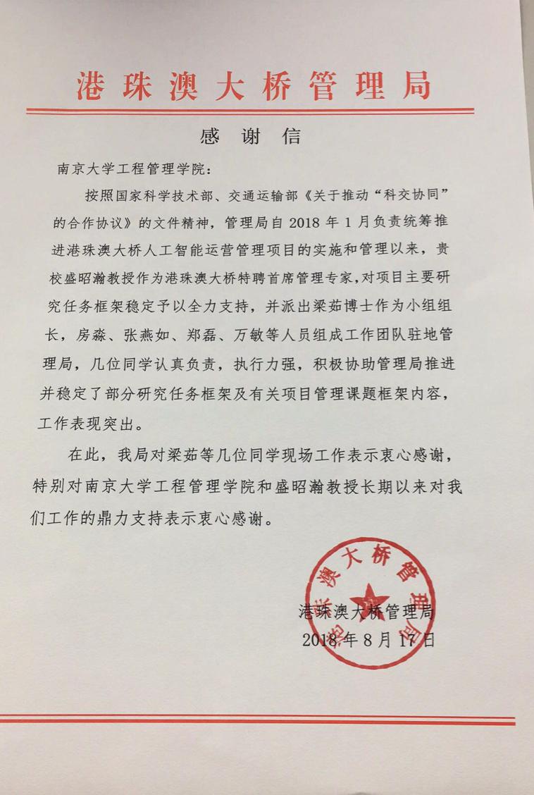 公司暑期派出盛昭瀚教授团队中的梁茹博士生作为小组组长,房淼、张燕如、郑磊、万敏等研究生组成工作团队赴港珠澳大桥管理局,开展关于港珠澳大桥人工智能运营管理项目的部分研究任务框架及有关项目管理课题框架内容研究。