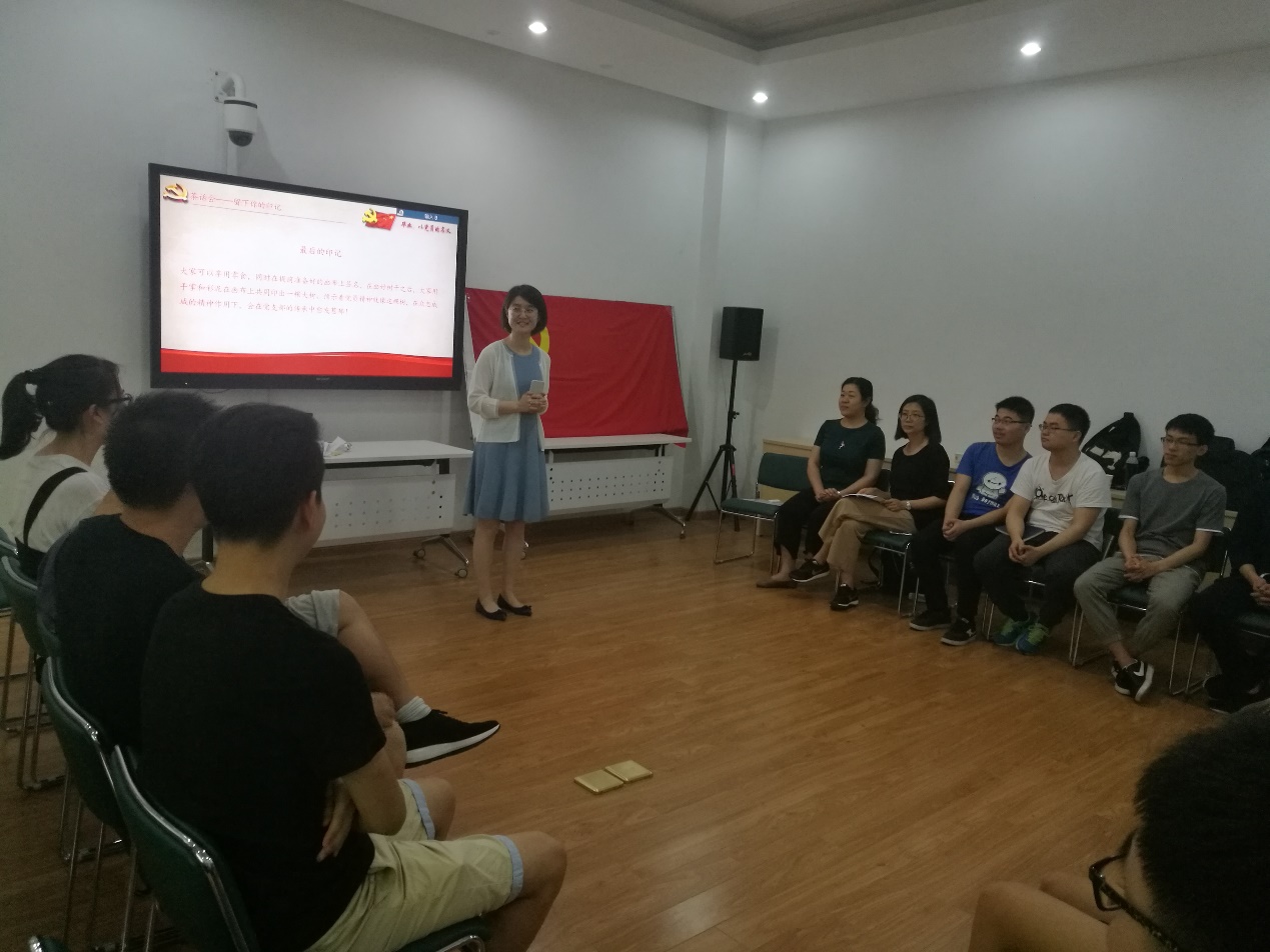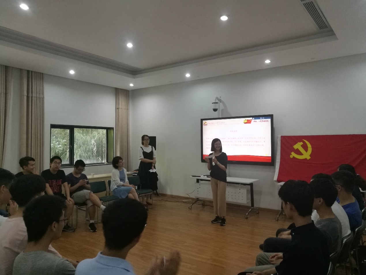 开场时,全体成员在主持人14级本科生高心仪的带领下,面对党旗宣誓,重温入党时的誓词,唤起同学们在大学期间关于入党仪式的记忆,表达了为共产主义事业奋斗终身的理想和信念。宣誓之后在14级本科生胡彬和郭皓辰的带领下,朗读毛泽东同志的《沁园春·长沙》,气势磅礴的诗词让同学们心中怀有万千豪迈之情,即使毕业也不忘为共产主义事业而奋斗,“恰同学少年,风华正茂”,年轻人更应该不忘初心,牢记使命。