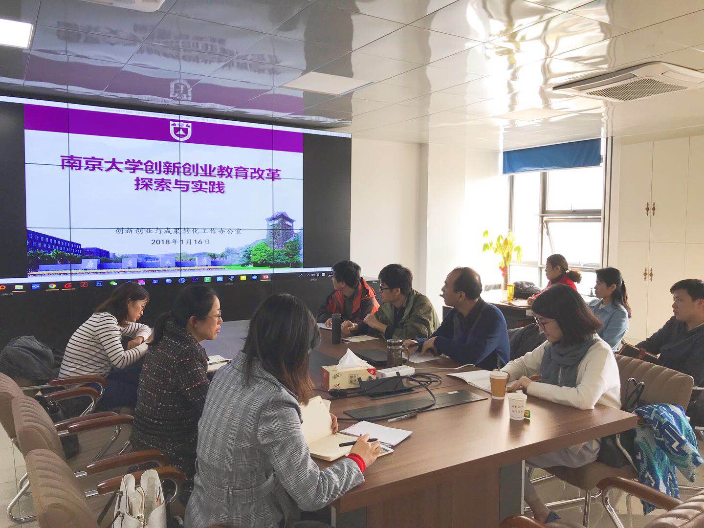 董婷主任首先介绍了创新创业与成果转化工作办公室设立的背景情况和机构设置,重点介绍了学校的创新创业教育体系、现有平台布局、“互联网+”大赛成绩、双创经费使用要求和双创示范基地评估准备等。随后董主任还向各位师生展示了双创办2017年十大工作,并就双创示范点的未来发展提出了具体的要求。