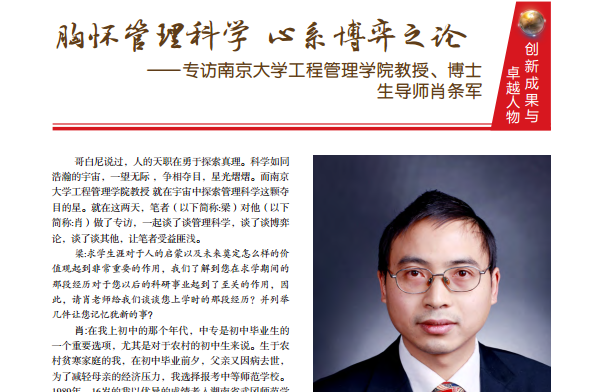 公司肖条军教授入选中国科技产业化促进会编著的《创新成果与卓越人物》封面人物,采访主题为“胸怀管理科学 心系博弈之论”,具体内容如下:
