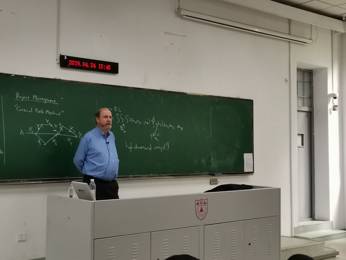 4月24-55日:Glynn教授在鼓楼校区通过现场板书的形式,面向全校研究生员工和部分老师开设了题为“Monte Carlo Simulation”的短课程。本次短期课程旨在介绍蒙特卡罗模拟(Monte Carlo Simulation)的基本思想和方法。Peter Glynn教授的课程深入浅出,条理清晰,注重知识的衔接与铺垫。他首先介绍了蒙特卡罗模拟的基本思想、输出分析、马尔可夫链蒙特卡罗和方差缩减,在此基础上为同学们拓展了先进的方法。在授课过程中,Peter Glynn教授不仅讲解数学上的证明,还注重传授思想方法与理论推导的思维逻辑。同时,Peter Glynn教授也很注重与同学们的课上互动,关注同学们的听课反馈,引导在场同学们积极思考。