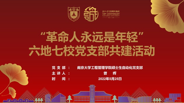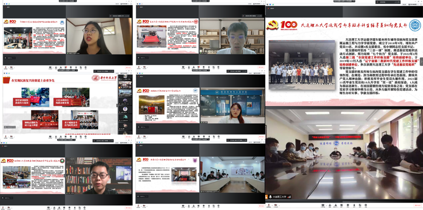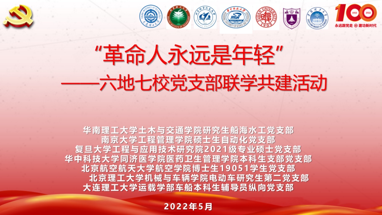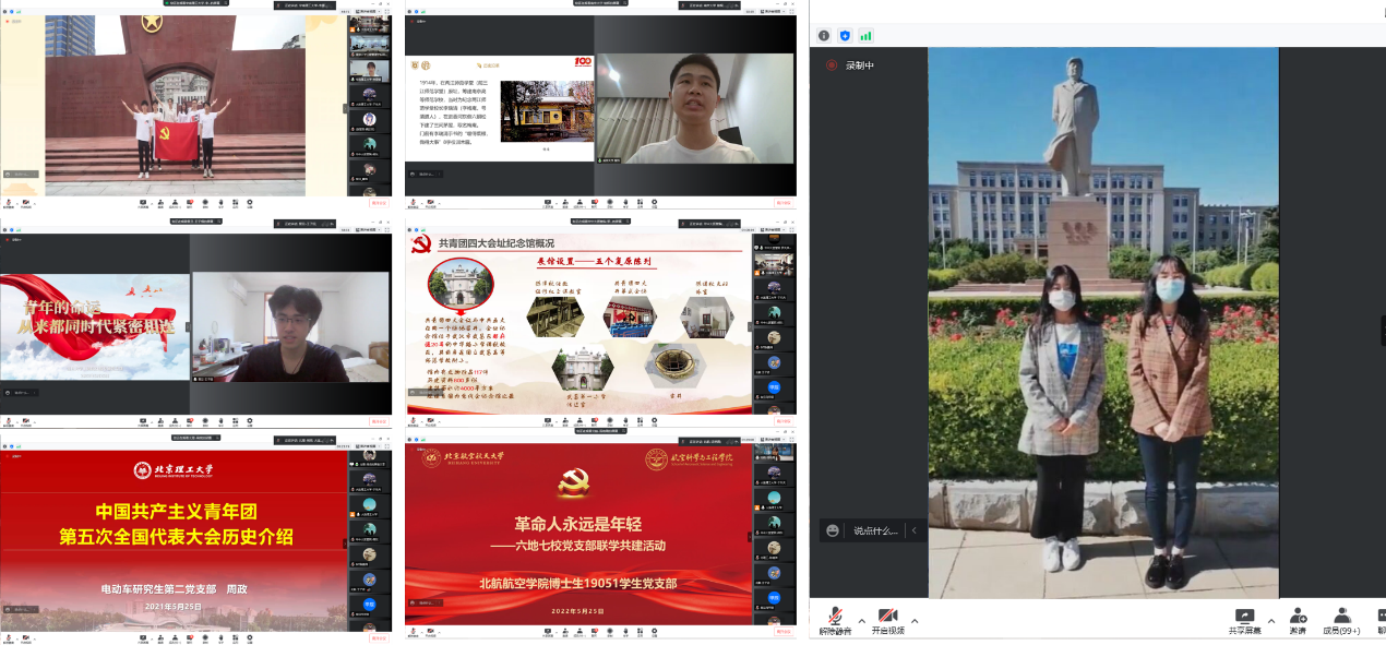 各党支部创新联建模式,依次进行线上直播互动,结合“共青团”的历届代表大会在广州、南京、上海、武汉、莫斯科、北京等地召开的历史,回顾百年征程。华南理工大学土木与交通学院研究生船海水工党支部提前在团一大会址广州越秀区东园旧址录制了宣讲视频,带领与会党员云参观了“团一大”纪念馆,百年前,旗展东园,见证了中国青年的觉醒和奋起。复旦大学工程与应用技术研究院2021级专业硕士党支部讲解了“团三大”在上海的召开过程和历史意义,并与近期上海疫情期间支部党员抗击疫情,志愿服务的行动相结合,踏踏实实干事。华中科技大学医药卫生管理学院本科生党支部介绍了同在当时的国立武昌高等师范学校附属小学召开的“团四大”和“党的五大”的历史,见证困难时期广大团员青年对党的忠贞不渝。北京理工大学机械与车辆学院电动车研究生第二党支部回顾了在国外莫斯科举行的“团五大”的历史,大会根据中共六大的有关决议和中国共青团工作的实际制定了团的工作方针和任务,带领青年与党同心,跟党奋斗。北京航空航天大学航空学院博士生19051员工党支部介绍了在北京召开的团代会历史,回顾了团歌《光荣啊,中国共青团》的创作过程,温习了《团章》的发展与规范,展现了青年引领风尚的精神风貌。大连理工大学运载学部车船本科生辅导员纵向党支部在学校主楼前毛泽东主席塑像下,介绍了新中国成立后团的代表大会的情况,用青春之我来展示内心的最强音。