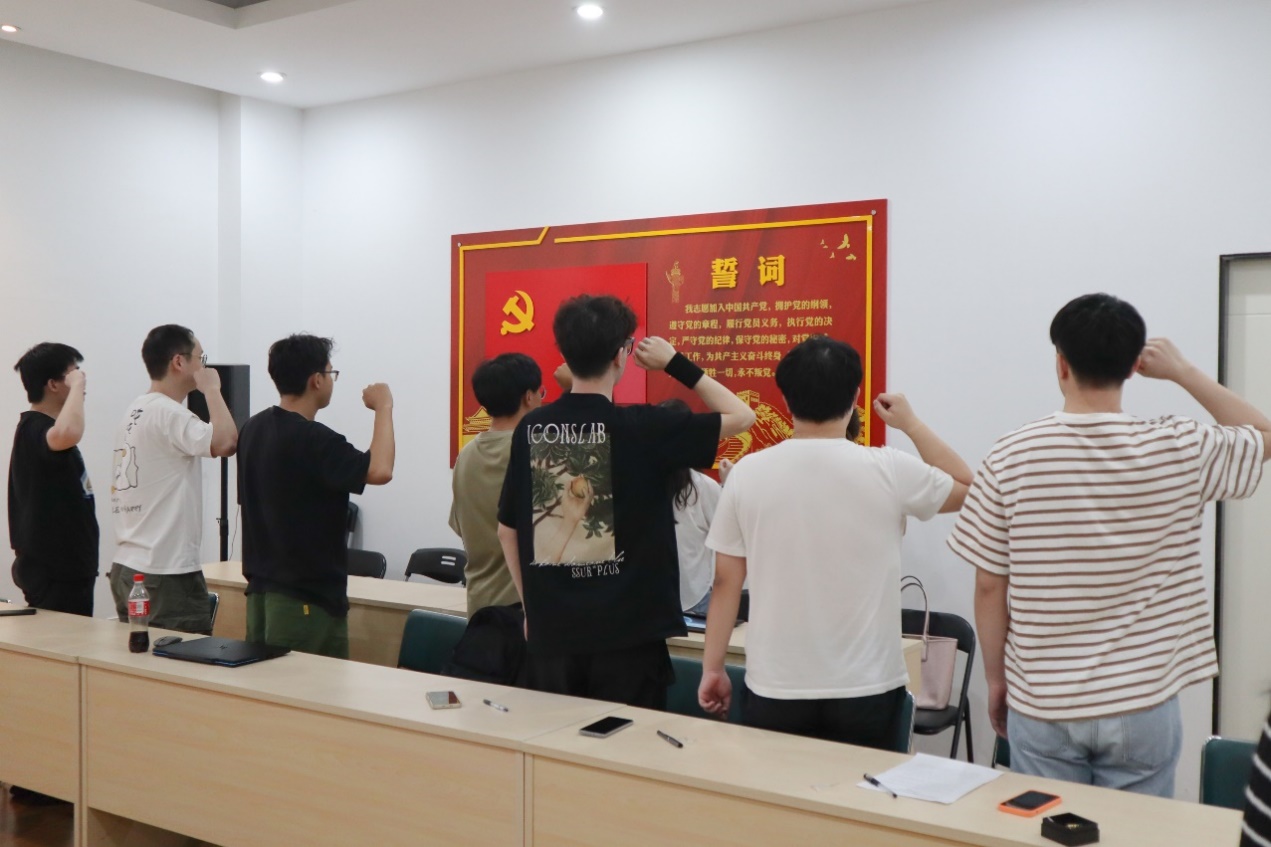 活动最后,赵罗钢同志带领与会党员重温入党誓词。全体党员高举右拳,面向鲜红的党旗,庄严宣誓,在铮铮誓言中,硕士生自动化党支部的全体党员们重温起自己作为一名中国共产党人的信仰及奉献的初心。