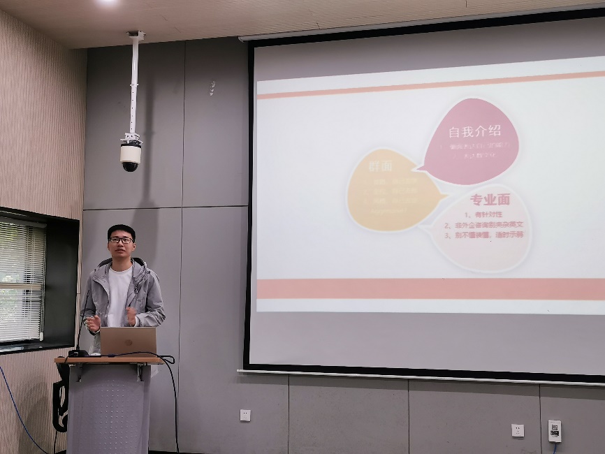 来自2018级第一党支部的党员程新宇,他主要分享研究生实习与就业的经验。程师兄拟就职券商,曾在券商、资管、公募等多家机构实习,在校期间发表过Sci一区核心,获得过挑战杯数模奖项,目前负责员工会的实习推荐工作。他首先从求职者的角度对研究生求职时的考虑因素进行系统梳理,为同学们提供了决策因子框架。同时,针对金融市场中不同的细分市场和细分行业,他站在招聘者的角度整理了影响成功录用的因素,为同学们的求职提供了细致的参考。然后,他介绍了一些求职面试和招聘流程的经验,着重提到心态的重要性,不要因为一时挫折而泄气。