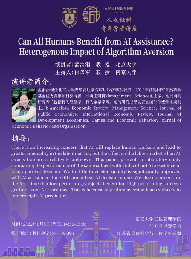 人文社科青年学者讲座:Can All Humans Benefit from AI Assistance? Heterogenous Impact of Algorithm Aversion
