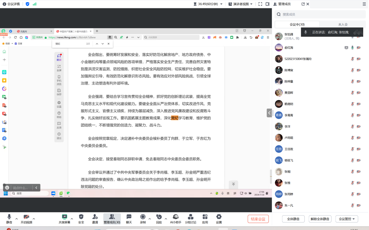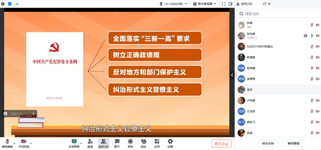 活动伊始,支部书记张怡潍同志领学《中国共产党纪律处分条例》,支部党员通过微党课对《条例》的历次修订情况、党的纪律建设的总体要求等展开深度学习。围绕高质量开展党纪学习教育的目标要求,张怡潍强调全体党员应该主动在学纪、知纪、明纪、守纪上下功夫,确保党纪学习教育入脑入心、走深走实、见行见效。