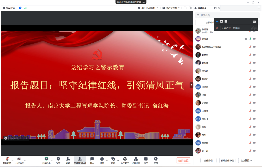 最后,学院经理、党委副书记俞红海教授作题为“坚守纪律红线,引领清风正气”的专题报告。俞红海教授从违反廉洁纪律、政治纪律及学术不端问题三个维度出发,深入剖析了违纪行为的危害性和后果,希望党员同志要以案为鉴,加强科研诚信建设,共同营造学校风清气正的科研环境。期间,俞红海教授还引用了中国共产党第二十届中央委员会第三次全体会议公报的内容,强调全党要巩固拓展主题教育成果,深化党纪学习教育,维护党的团结统一,不断增强党的创造力、凝聚力、战斗力。