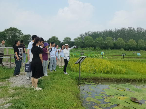 第二站,团队来到管湾湿地公园,沉浸式感受近年来梁园镇在生态文明建设中的成果。走在绿意盎然的生态步道上,远眺碧水悠悠、芦苇轻摇,近观水杉挺拔、鸟鸣婉转,同学们直观感受到“绿水青山就是金山银山”的科学理念在乡村大地上的生动实践。在研学基地,同学们近距离观察“碰碰香”等多种植物,在感知自然细节中领悟生态保护与可持续发展的深远意义。