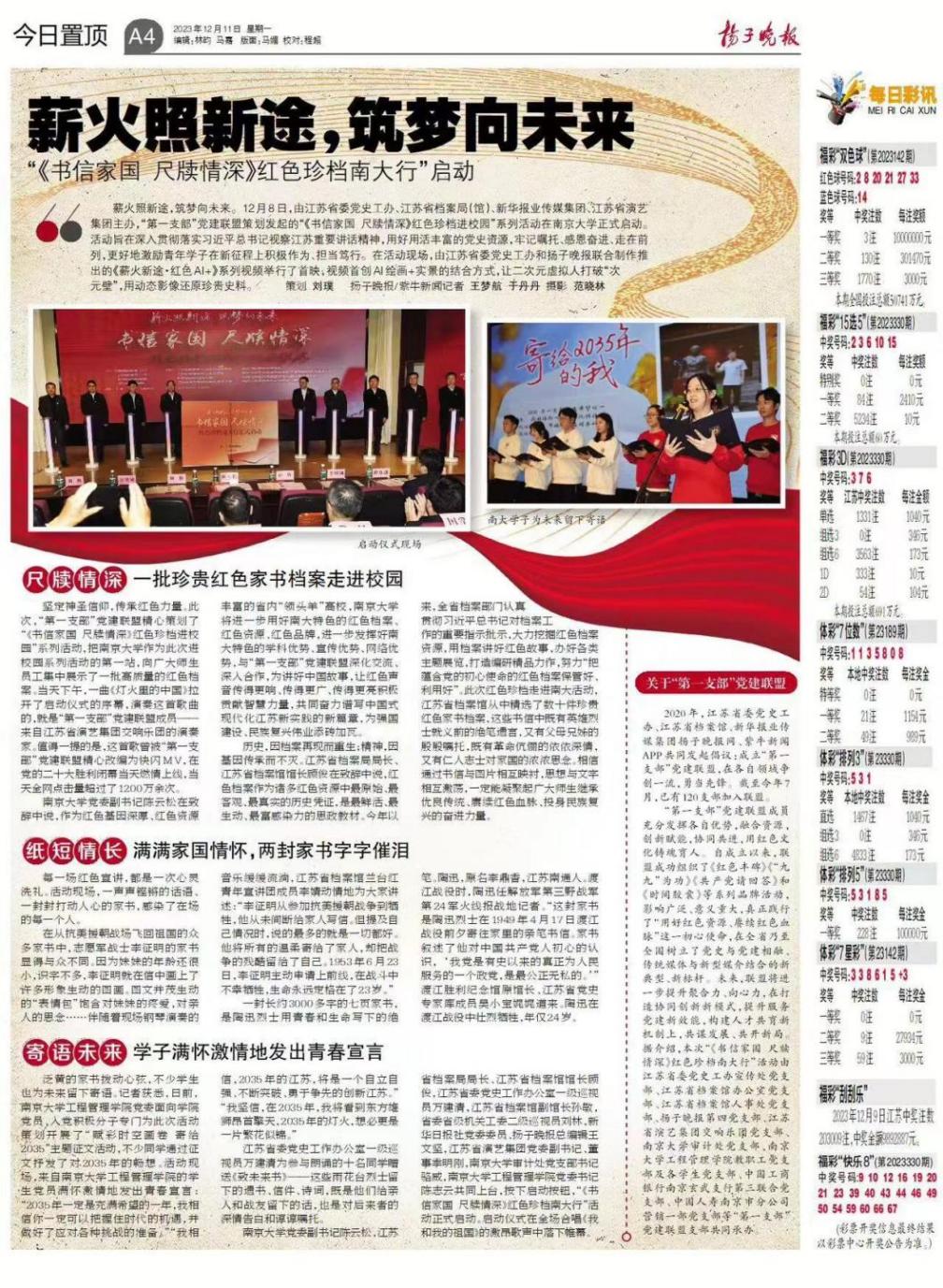 薪火照新途,筑梦向未来。12月8日,由江苏省委党史工办、江苏省档案局(馆)、新华报业传媒集团、江苏省演艺集团主办,“第一支部”党建联盟策划发起的“《书信家国 尺牍情深》红色珍档进校园”系列活动在betway88西汉姆联正式启动。活动旨在深入贯彻落实习近平总书记视察江苏重要讲话精神,用好用活丰富的党史资源,牢记嘱托、感恩奋进、走在前列,更好地激励青年学子在新征程上积极作为、担当笃行。在活动现场,由江苏省委党史工办和扬子晚报联合制作推出的《薪火新途 红色AI+》系列视频举行了首映,视频首创AI绘画+实景的结合方式,让二次元虚拟人打破“次元壁”,用动态影像还原珍贵史料。