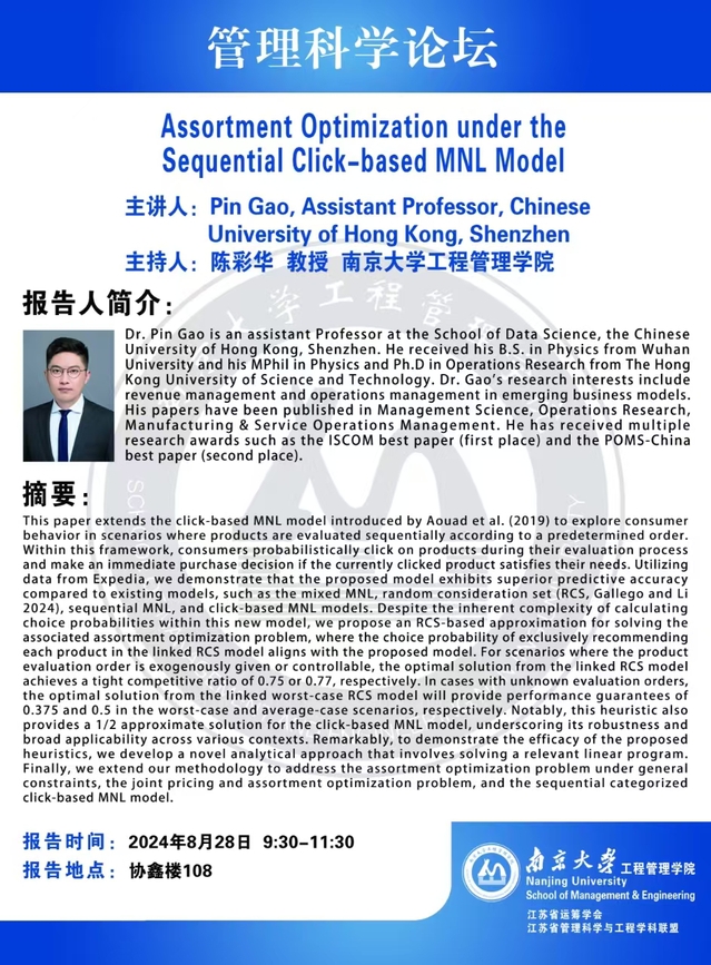 管理科学论坛:Assortment Optimization under the Sequential Click-based MNL Model