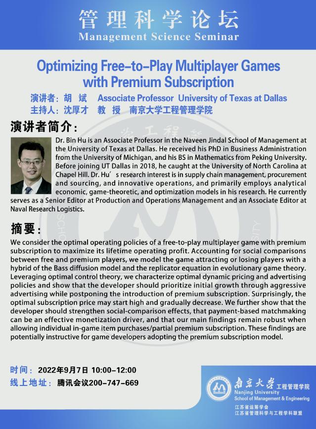 管理科学论坛:Optimizing Free-to-Play Multiplayer Gameswith Premium Subscription