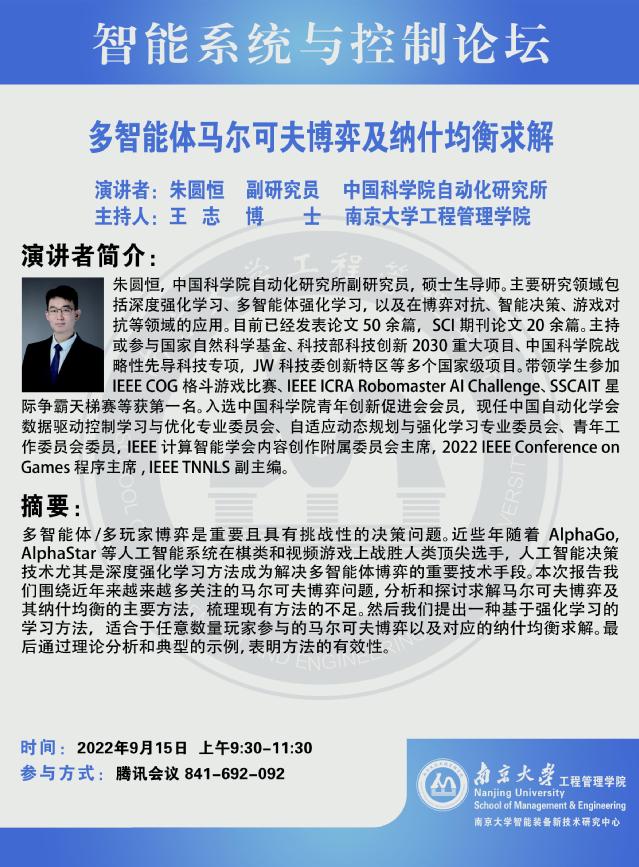 智能系统与控制论坛:多智能体马尔可夫博弈及纳什均衡求解