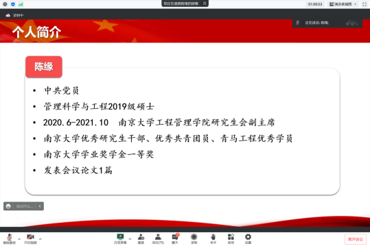 来自2019级管理科学与工程专业的陈缘就公考经历进行分享。她谈到了自己选择公考的心路历程,并对名校优选、人才引进的各方面内容进行了详细地介绍。她鼓励大家勇于尝试,探索所爱,坚定所选,奋勇向前。