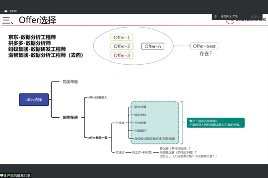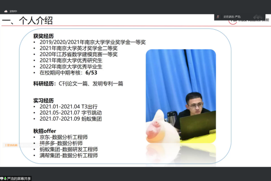 来自2019级工业工程专业的严浩对互联网行业的数据分析岗求职历程进行了分享。他对于当时职业规划的所思所想所行进行了生动地阐述,从日常实习暑期实习、核心岗位非核心岗位几个角度进行讲解。他建议从自己的特点出发,选择和自己风格更相似的岗位,在岗位中体现自己的价值。