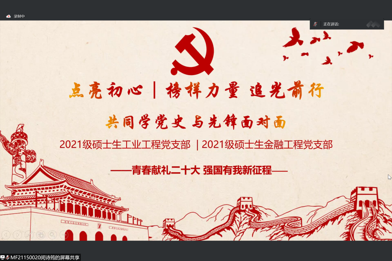 为贯彻落实“青春献礼二十大 强国有我新征程”专题活动,充分发挥榜样力量,传播正能量,形成学榜样、践初心、增本领的良好氛围,引导刚步入研究生二年级的同学们树立正确的价值观,2022年9月17日晚,betway88西汉姆联2021级硕士生工业工程党支部和2021级硕士生金融工程党支部共聚云端,开展了“榜样力量 追光前行”共同学党史、与先锋面对面主题党日活动。