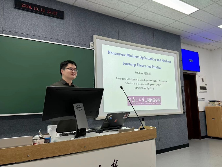 工业工程与运营管理系的张思奇老师作了题为“Algorithm Design and Analysis in Large-Scale Nonconvex Minimax Optimization”的学术报告。该报告介绍了非凸极小极大优化问题中的算法设计与相关的理论分析的近期工作进展。结合人工智能方面的应用,该报告介绍了在大规模非凸极小极大优化问题中如何设计高效算法,并分析了相关算法的收敛性能,并进一步介绍了这些优化算法的泛化性能分析理论,最后还介绍了该类问题在分布式学习中的相关应用,提出了相关的通信加速算法并给出了理论分析与实验验证。