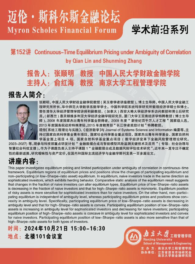 迈伦·斯科尔斯金融论坛:Continuous-Time Equilibrium Pricing under Ambiguity of Correlation